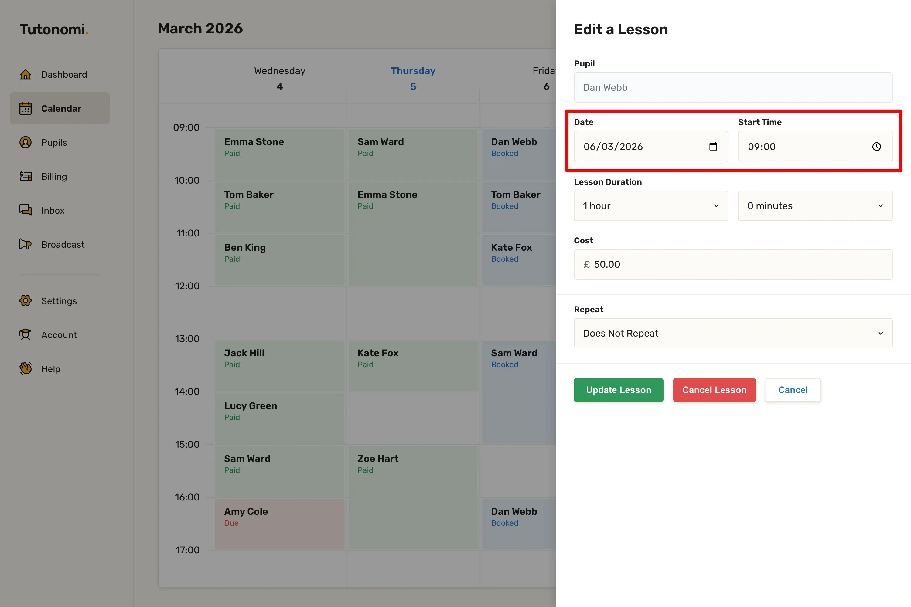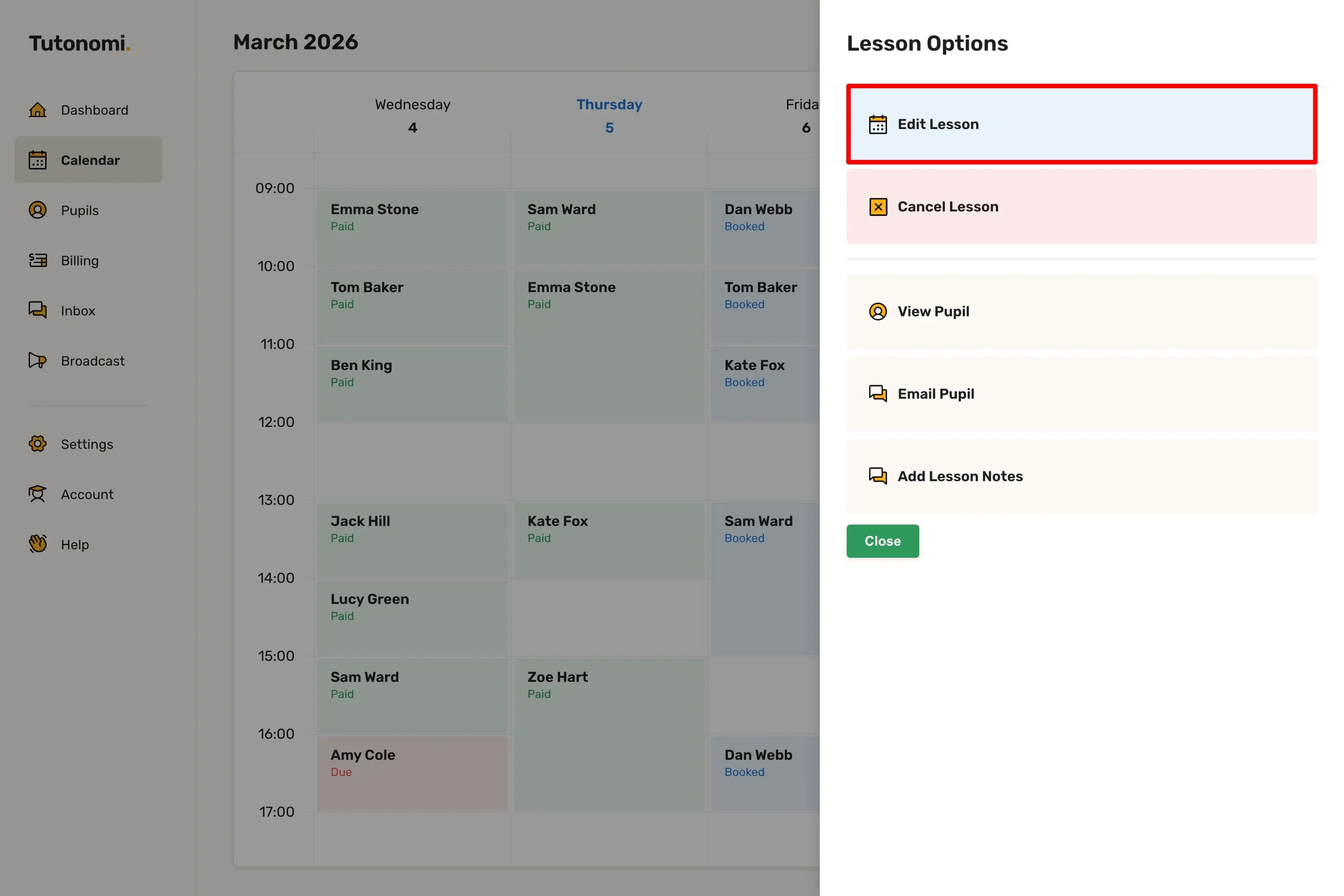 Pupils are notified automatically — you can message them from the lesson options if needed